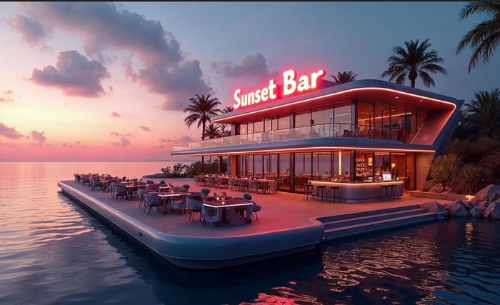 Die Sunset Bar, mit ihrer futuristischen Terrasse direkt am Wasser, ist der perfekte Rückzugsort für die Antarfari-Crew. Hier, unter dem leuchtenden Schriftzug „Sunset“ und begleitet von atemberaubenden Ausblicken auf die neonfarbenen Skyline, genießen sie oft ein Bier, schmieden Pläne und sammeln neue Kraft für ihren Kampf gegen die zentrale Macht.